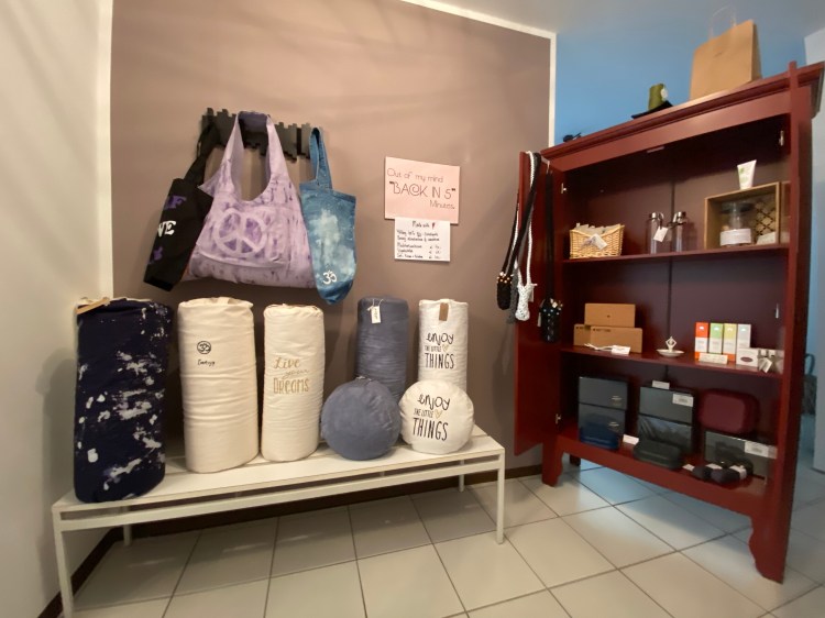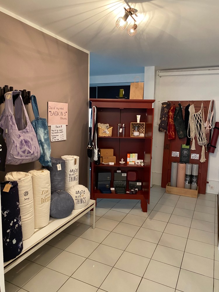 Im Studio habe ich einen kleinen local Store, indem ihr handgemachte Mala ´s, Bolster, Meditationskissen, Taschen, Kleidung und allerlei rund um Yoga finden könnt.